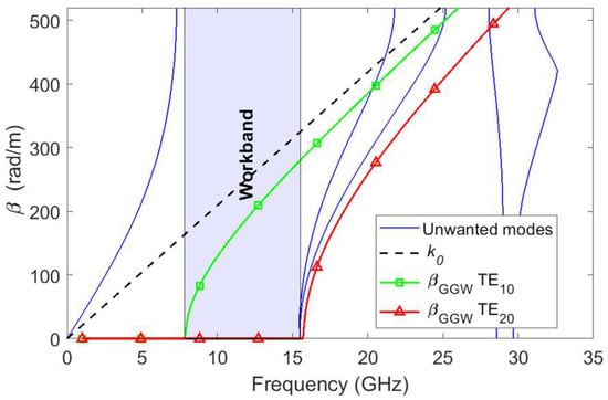 As shown in Figure 1, a vertically polarized GGW is used [22]. In this subsection, we consider the structure without the central metallic pins (, ), to emulate a standard empty rectangular waveguide. The bottom plate includes two periodic structures of three rows of square metallic pins () with pitch p, which are separated from each other by a groove width W. Both periodic structures act as artificial perfect magnetic conductor (PMC) sidewalls in a certain frequency band and do not allow wave propagation along the x and y transverse directions between the gap h. The upper plate is situated at a height from the bottom part and realizes a perfect electric conductor (PEC) surface. In this way, by adjusting the dimensions of the periodic structure and the width W of the groove area, it is possible to propagate a quasi- mode. Table 2 includes the optimized GGW dimensions that lead to the dispersion diagram of Figure 2, which was obtained with an electromagnetic (EM) simulator (HFSS) to achieve the high-pass characteristic of the GGW with a cut-off frequency GHz at dB. As can be seen in Figure 2, the desired mode in the GGW propagates along the z-axis, inside the stopband of the periodic structure, thus avoiding leakage in the transverse plane between 8.3 GHz and 15.5 GHz. The dimensions W and b of the GGW given in Table 2 match the WR-75 standard rectangular waveguide size.