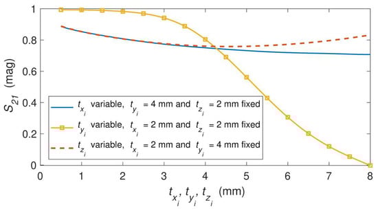 |S21|of the simulated ith-section (Figure 3) as a function of the dimensions of the metallic pins: txi (tzi = 2 mm and tyi = 4 mm fixed), tyi (txi = tzi = 2 mm fixed) and tzi (txi = 2 mm and tyi = 4 mm fixed).