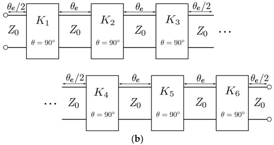 The design of the proposed fifth-order GGW bandpass filter (Figure 1) is performed by combining the high-pass behavior of the GGW with a low-pass Chebyshev filter synthesis method based on stepped impedances [46,47], thus allowing us to control its bandwidth. The lower cut-off frequency () of this filter was previously adjusted to the desired value (Table 1), optimizing the GGW dimensions as in Section 2.1. Following this, the synthesis method based on stepped impedances was applied to obtain the transfer function of the fifth-order Chebyshev filter according to the design specifications ( RL, ) required by Table 1. The five characteristic impedances (Figure 5a) of the filter are extracted by applying an iterative algorithm to the [ABCD] matrix and the previously determined transfer function [47]. To achieve a practical implementation of the filter as in Figure 1, the five stepped impedance transmission lines () with electrical length () in Figure 5a are transformed into six sections (Figure 5b) of same impedance () and electrical length () by means of impedance inverters (). In Figure 5b, the impedance inverter corresponds to the metallic pin of the ith-section of the filter (Figure 3), while the electrical length is related with the physical section length . The normalized impedance inverter and -parameter are given by: