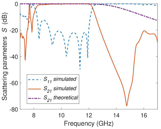 Theoretical and simulated S-parameters of the fifth-order wideband GGW Chebyshev bandpass filter.