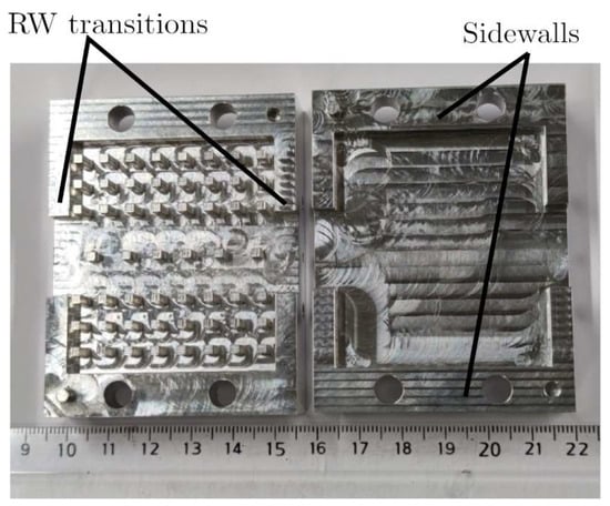 The CNC machining technique is a subtractive manufacturing method. This technique removes parts of a material bulk from rotary tools to achieve the desired device shape. The bulk of material can be plastic, wood, metal, etc. The two parts of the proposed GGW bandpass filter were CNC machined from a bulk of 6082 aluminum with a tolerance of ± 100 μm. The conductivity of 6082 aluminum given by the manufacturer is . Figure 7 shows the photograph of the two parts of the fifth-order GGW Chebyshev bandpass filter manufactured in aluminum using a CNC milling machine. Sidewalls and rectangular waveguide (RW) transitions have been added to the structure for the measurements. The sidewalls were located at 4 mm from the last row of pins of the periodic structure, while the rectangular waveguide transitions with WR-75 standard and length 5 mm were placed at 1.7 mm from the GGW bandpass filter input/output ports. An arithmetic average roughness of Ra = 0.15 μm was measured.