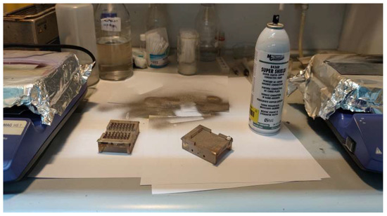 This method consists of an impregnation technique that allows the deposition of thick films by spray coating. This technique is cheaper and faster than the previous one since it does not require expensive equipment or a long vacuum process. A conductive layer () of thickness t = 50 μm was deposited on the surfaces of the two parts of the resin-based GGW bandpass filter prototype (Figure 8c) using a conductive paint spray system (Figure 10). The spray system contained the MG Chemicals 843AR conductive paint, which is composed of acrylic lacquer, pigmented with silver-coated copper flakes. The arithmetic average roughness of this metallized resin-based prototype is Ra = 4.8 μm.