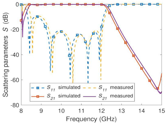 The measured S-parameters (Figure 11) of the fifth-order GGW Chebyshev bandpass filter manufactured in aluminum using a CNC milling machine show a good agreement with the simulated data. Regarding the EM simulations, the measurements show a slight shift of 50 MHz towards higher frequencies due to the manufacturing tolerance, which is ±100 μm. Between 10 GHz and 12 GHz, corresponding to the lower frequency of the recommended band of the WR-75 standard and the higher cut-off frequency fc,H of the filter, the return and insertion losses are, respectively, RL = 20 dB and IL = 0.3 dB. These losses deteriorate between 8.3 GHz and 10 GHz, due to the high dispersion of the quasi-TE10 mode (Figure 2) and to the frequency dependence of the impedance inverters (metallic pins) in this frequency range [19,47]. The out-of-band region has a spurious free range up to 15 GHz with a maximum rejection level RLSB = 70 dB.