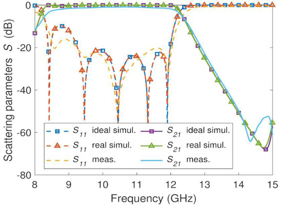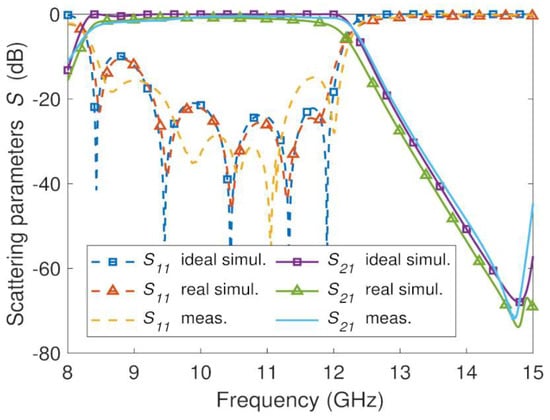The measured and EM simulation frequency responses of the three manufactured GGW bandpass filter prototypes shown in Figure 7 and Figure 8b,c are plotted in Figure 11, Figure 12 and Figure 13, respectively. The prototypes were measured from a vector network analyzer (R&S ZVA67). A WR-75 TRL (through, reflect, line) calibration KIT and a TRL calibration procedure were used for de-embedding the effects of the cables and SMA-rectangular waveguide transitions from the measurements of the prototypes between 8 GHz and 15 GHs. In this way, the S-parameters measurements of the prototypes were obtained between their input and output ports. This frequency range (8 GHz–15 GHz) allows single-mode operation (TE10) in the WR-75 rectangular waveguide and GGW (Figure 2). Below 8 GHz and above 15 GHz, accurate measurements of the prototypes cannot be carried out, since calibration errors and power fluctuations occur due to the cut-off frequency of the WR-75 rectangular waveguide TE10 mode and the superposition of the first- and higher-order modes in their structures (Figure 2), respectively. The conductivity () of the conductor and the roughness () of the surfaces were considered in the EM simulations (HFSS) of these three prototypes.
