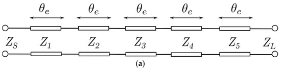 Equivalent circuits of a fifth-order stepped impedance filter. (a) Implementation using stepped impedance transmission lines. (b) Implementation using impedance inverters and transmission lines with the same impedance and electrical length.