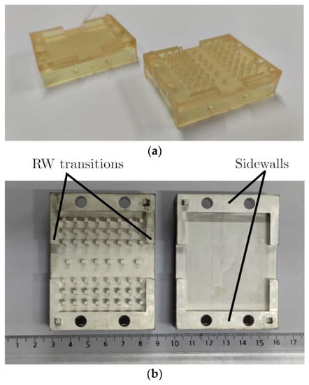 The 3D printing technique is an additive method that consists of making the desired 3D device layer by layer by means of resins, plastic filaments, metallic powders, etc. This technology is more ethical than previous CNC machining, since it generates less material waste to produce devices. The two parts of the proposed GGW bandpass filter (Figure 8a) were realized from a stereolithography-based 3D printer (Form 3B, Formalabs) and a photopolymer resin (Clear Surgical Guide Resin). This printer can achieve a layer thickness (y-axis) of 50 μm and a resolution in the (x, z) plane of 25 μm from this resin. In the same way as for the previously CNC machined filter, sidewalls, and rectangular transitions (WR-75) have been added to the structure for the measurements. Two resin-based prototypes were made. The manufacturing process of the resin-based GGW bandpass filter finishes by coating their surfaces with a conductive layer. The surfaces of one resin-based prototype were metallized using a high-vacuum thermal evaporation deposition technique, while those of the second resin-based prototype were coated by means of a conductive paint spray system.