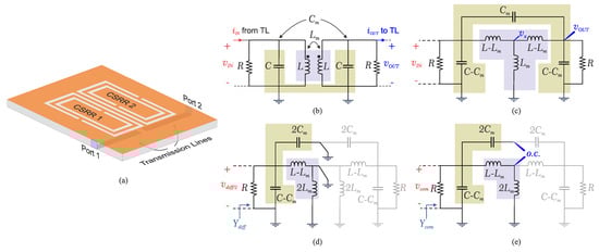 (a) Schematic of coupled CSRR. (b) Coupled resonator modeled by a parallel RLC model. (c) Simplified circuit considering the equivalent coupling capacitors/inductors. (d) Odd mode analysis. (e) Even mode analysis.
