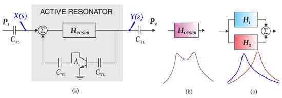In order to investigate the impact of the loss-compensating element such as amplifying transistors, it is helpful to reconsider the coupled structure in frequency domain with equivalent transfer function as shown in Figure 2a. The existing network incorporates a pair of discrete back-to-back resonators, configured in parallel since two resonance frequencies are distinct and the transmission response peaks at both frequencies and . The corresponding transfer function representations for each resonator, as shown in Figure 2b,c, are delineated as follows: