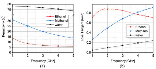 where the variables and represent the real components of the complex relative permittivity at static and infinite frequencies, respectively. Furthermore, denotes the relaxation time, which exhibits a direct relationship with the relaxation frequency. The relaxation frequency corresponds to the frequency at which both the imaginary component and the first derivative of the real component attain their maximal values. This model is accurate for the frequency span of interest, wherein only a single pole is present in the dispersive model of dielectric permittivity. Detailed observation of the dielectric properties of ethanol, methanol, and water is shown in Figure 3 with respect to the Debye parameters given in Table 1 [59], which demonstrates that the difference between the permittivity of water and ethanol/methanol increases at higher frequencies, leading to a high sensitivity. Therefore, a comparatively elevated frequency is chosen to enhance sensitivity [3,60]. Moreover, an inverse relationship exists between the resonator’s dimensions and the operational frequency mainly due to the penetration depth , where are frequency, permeability and conductivity of MUT, respectively. As a result, the frequency of operation for this structure is chosen to be within 2–3 GHz.
