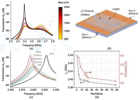 (a) Impact of bias voltage on measured transmission (). (b) The schematic of resonator hosting a microfluidic channel. (c) Measured (solid line) with V vs. simulated (dashed line) of common chemicals. (d) Corresponding measured frequency shifts black and sensitivity red vs. permittivity.