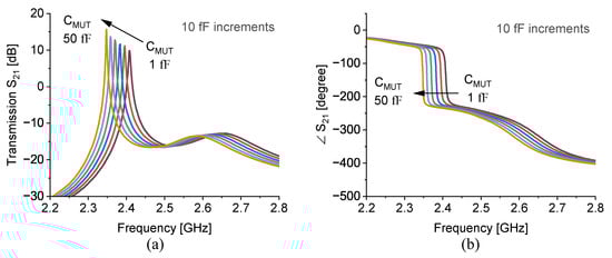 In another study, the contribution of various materials inside the microfluidic channel is simulated in a circuit simulator advanced design system (ADS) to extract the net capacitive impact of each material. In this regard, the sensor is modeled as shown in Figure 6b, yet the microfluidic channel is substituted by a capacitor that is across the adjacent slots of the CCSRR. As a result, a range of capacitance variation is explored that results in roughly the same downshift in the resonance frequency that is achieved by HFSS simulations. Figure 7a demonstrated the magnitude of as well as phase variations in Figure 7b demonstrate how the transmission profile undergoes a change when the capacitor value is swept from 1 fF up to 50 fF with 10 fF increments. It is thus clear that the MUT impact on the CCSRR is quite minuscule in magnitude.