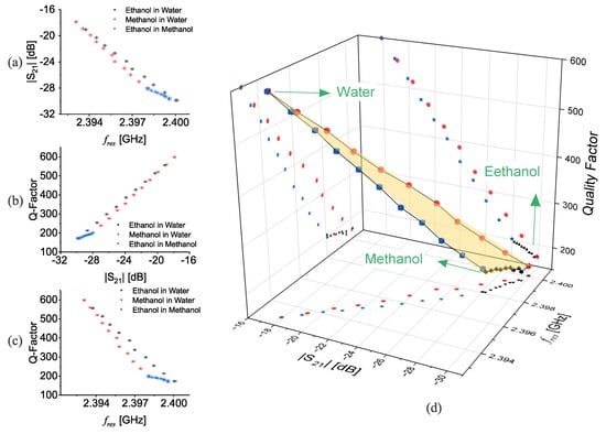 The sensor response in frequency F, amplitude A, and quality factor Q undergoes an effective change as the composition of the mixture varies. However, due to the lack of selectivity, the sensor output () could be mapped to multiple combinations of several known materials, making it challenging to identify individual constituents within the mixture unambiguously. This phenomenon is known as the “cross-sensitivity” issue, where the sensor’s response may be similar for different material combinations, leading to potential misinterpretation of the measurement data. This shortcoming leads to eliciting more than one parameter at the same time to infer their internal properties. In this regard, water, ethanol, and methanol are chosen as three common liquids to study their binary mixture on the proposed CCSRR. Various concentrations of the mixtures from with increments of are measured and , and Q, are extracted from transmission response, as shown in Figure 9a–c.