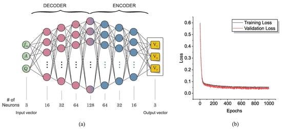The dataset generated for training and validation purposes is split into a ratio of 80:20. The validation dataset, randomly selected, is kept entirely separate from the training process. The validation loss is thus a crucial measure of the performance of the trained neural network as it provides an unbiased evaluation of the model’s ability to generalize to unseen data. Figure 10b depicts the training and validation loss functions over the course of the training process, which showcases a significant reduction within the first 40 epochs. Additionally, it is important to note that various network topologies and numbers of hidden layers were examined prior to finalizing the network. Our study indicates that a lower number of hidden layers results in inadequate attenuation of the training and validation loss, whereas a higher number of hidden layers leads to a higher validation loss. This evidence underlines the importance of choosing an appropriate architecture for the DNN, balancing complexity with the capacity to learn and generalize.
