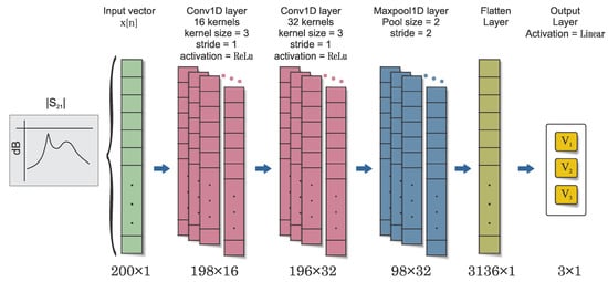 CNNs, owing to their hierarchical structure and ability to extract robust high-level features, have demonstrated strong learning capabilities and generalization performance, making them well-suited to this task. The proposed CNN architecture comprises two 1D convolution layers, one 1D max pooling layer, one flatten layer with dropout, and a final dense or fully connected layer with softmax or sigmoid activation for classification output, as shown in Figure 11. The raw one-dimensional sensor transmission response, denoted as x[n], is fed as input to the first convolutional layer. The convolutional layers use filters or kernels to produce feature maps by convolving with the input signal. The number and size of kernels are key for capturing relevant features from the signal. The output of each convolution operation is calculated using a specific equation, where the activation function is applied to the sum of bias and the convolution of the previous layer’s features and the current layer’s kernels. The first convolution layer contains 16 convolution kernels, and the second convolution layer contains 32 kernels. Each kernel has a size of v = 3 and a stride of 1. The filter weights are initialized using the He uniform initializer [61], and the bias vector is initialized to all zeros. This operation is performed for each filter in both layers, resulting in 16 outputs for the first convolution layer and 32 outputs for the second convolution layer. The activation function used is the rectified linear unit (ReLU), which introduces nonlinearity into the model and is defined as the maximum of 0 and the input. This function is known to accelerate the convergence of stochastic gradient descent compared to other functions.