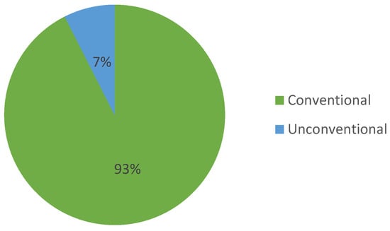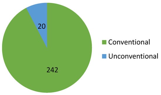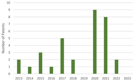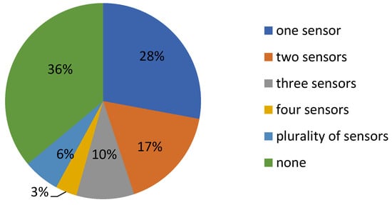 Table 1 presents the bibliographic references according to the type of sensor used. Bibliographic references where sensors were not used or given, such as patents [,,,], were removed. In Figure 2, the distribution of the patents is displayed according to the type of sensor used.