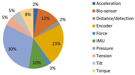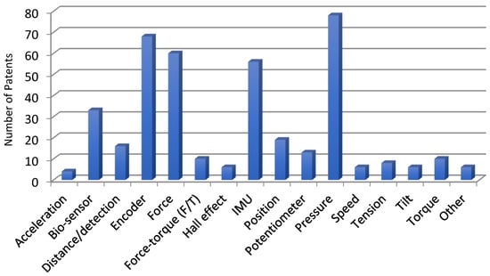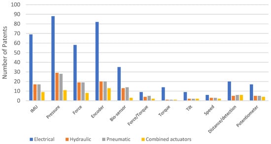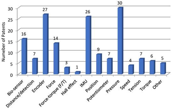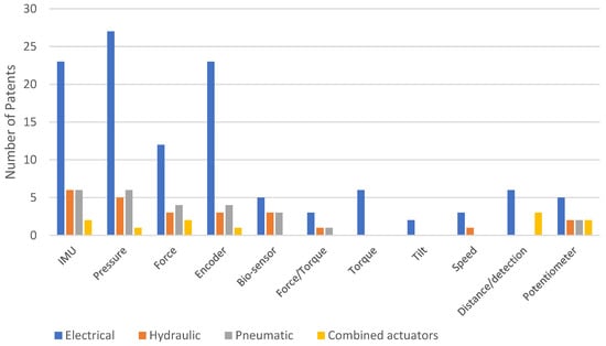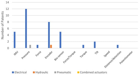 Pressure actuation-based sensors were the most commonly used, with nearly 30% of patents including them in their components. According to Table 2, foot plantar sensors were the most frequently used pressure sensors. This was expected, as a significant number of exoskeletons follow the step cycle of users.