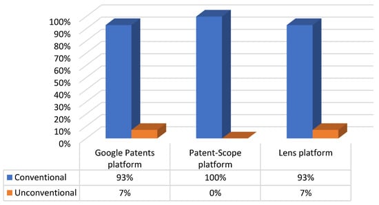 With the above keywords and Filters 1, 2, 4, 6, and 7, we initially retrieved 5012 patents on Google Patents, 39 patents on Patent-Scope, and 1029 patents on Lens. Then, after applying Filters 3, 5, and 8, we obtained 1615 patents from Google Patents, 27 patents from Patent-Scope, and 122 patents from Lens. Finally, after using Filters 9 and 10, we obtained 283 patents on Google Patents; the exact number remained on Patent-Scope, and 67 patents were published on Lens.