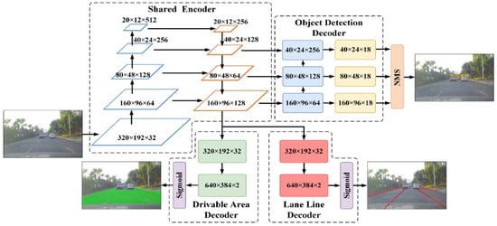 Considering the advantages of the multi-task model with hard parameter sharing, such as simple structure, high operating efficiency, and low over-fitting risk, a multi-task model YOLO-ODL based on hard parameter sharing is proposed to achieve joint and efficient detection of objects, drivable areas, and lane lines. The structure of the YOLO-ODL model is shown in Figure 2, which consists of one shared encoder (Shared Encoder) and three decoders (Detection Encoder, Drivable Area Encoder, and Lane Line Encoder) to solve specific tasks.