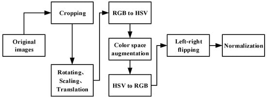 Since we only used BDD100K data set for training, the data were augmented in order to avoid overfitting and improve the generalization ability of the model. The data augmentation adopted included rotating, scaling, translation, color space augmentation, and left–right flipping. The data augmentation process is shown in Figure 3.