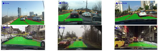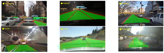 In view of the variability of weather and the complexities of road scenes, the YOLO-ODL model was tested under multi-weather and multi-scenario road conditions, respectively, to further embody the robustness of the acceleration model. As shown in Figure 5 and Figure 6, YOLO-ODL had strong robustness in multi-weather and multi-scenario road conditions and could well detect traffic objects, drivable areas, and lane lines.