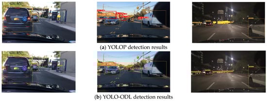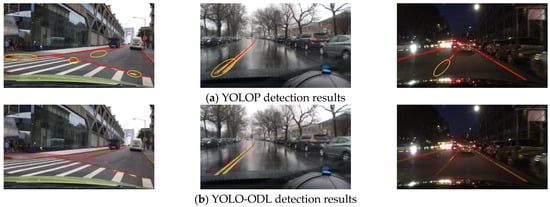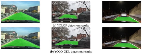 As shown in Figure 7, Figure 8 and Figure 9, we compared the detection effects of YOLO-ODL and YOLOP on three tasks. Object detection results are shown in Figure 7. YOLOP was prone to false detections and missed detections, mistakenly detecting complex house backgrounds as vehicles, missing the detection of vehicles in the distance. Figure 8 shows drivable area detection results. YOLOP had incomplete detection and many false detection areas, whereas the drivable area detected by YOLO-ODL was more accurate and complete. Lane line detection results are shown in Figure 9. The lane lines detected by YOLO-ODL were more accurate and continuous, but the lane lines detected by YOLOP were discontinuous, and there were more noise areas.