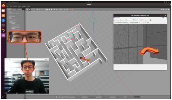In this paper, a virtual scene for eye-tracking direction detection was built under the robot operating system ROS using Gazebo software, as shown in Figure 2. The virtual scene is a maze, and there is a car in the maze, which matches the virtual camera so that the perspective of the volunteer is consistent with that of the car. The volunteers keep their heads still while watching the road in front of the car with their eyes and control the movement of the car through the keyboard, simulating the movement of a wheelchair in a real-life scenario. When the state of the car is shown (as in Figure 2), volunteers look at the feasible road on the right side of the wall, and at the same time control the car to the right through the keyboard. The volunteer’s facial image is captured and recorded by a camera placed in the center of the computer screen, while the volunteer’s actions on the keyboard are recorded by a script to achieve hand–eye synergy data collection. Through this method, the eye-tracking dataset in the virtual scene was established.