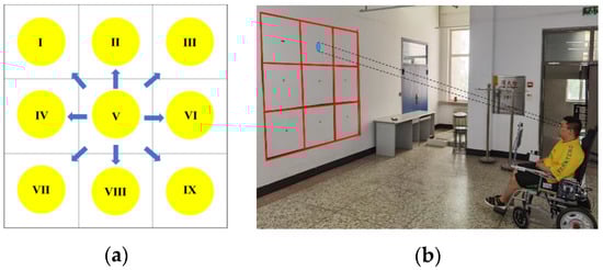 We set up an environment for eye-tracking data acquisition in a real scene, as shown in Figure 3b. The scene consisted of a wall with a nine-grid (as shown in Figure 3a), a laser pointer, and a wheelchair with a fixed camera. The nine-grid was a square area of 210 cm 210 cm in size, each grid size was 70 cm 70 cm, and a red sign was pasted in the center. When the volunteer’s eye gazes at the designated red sign, the direction of the human eye gaze becomes a nine-classification problem, which reduces the influence of the volunteer’s subjective behavior. In the real scene, the experimental assistant pointed to the red mark in the center of the grid with a laser pointer row-by-row from left to right, while the volunteer sat in a wheelchair and kept his head still, staring at the positions illuminated by the experimental assistant, and each position was maintained for 10 s. At the same time, the facial changes of the volunteers were recorded in real time by the camera on the wheelchair. Each frame of facial data was automatically marked according to the time the frame belonged to.