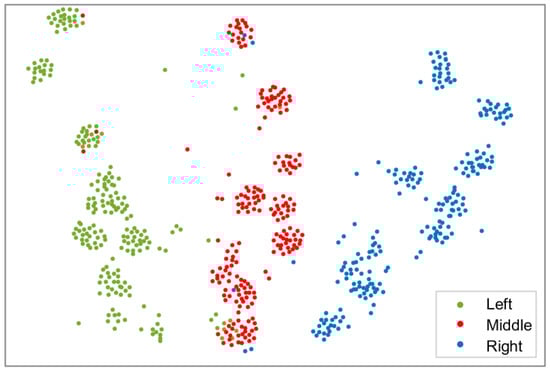 The data collected in the real environment in Section 3.2 had nine different labels, but after visualization by t-SNE [44], these labels could be directly transformed into three categories, which is also consistent with reality. For example, when the test volunteers gazed at the leftmost column, their eye features were approximately distributed in the same region regardless of the column they gazed at. Therefore, the three category labels could be cleverly used to uniformly mark the datasets of the real scene, which is exactly the same as the label classification of the datasets collected in the virtual environment, which is convenient for further dataset screening. The t-SNE visualization effect is shown in Figure 5.