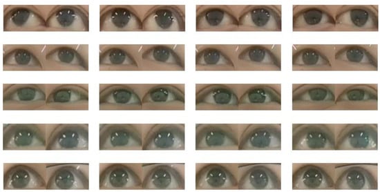 For the convenience of description, we introduced some symbols: Among them, the set represents 100 volunteers participating in the data collection. Each contains 1350 photos, and each photo has a corresponding label. represents the set of labels, corresponds to the label left, corresponds to the label forward, and corresponds to the label right. A total of 135,000 pictures with gaze labels in different directions were selected to provide training data for the algorithm training in the next section. The established dataset is shown in Figure 6.