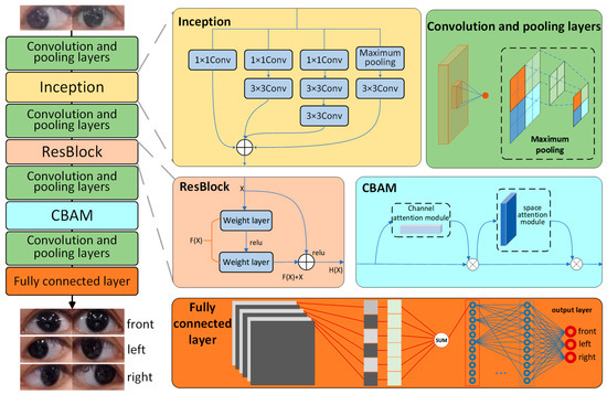In this paper, we fully traded off the lightweight and accuracy of the algorithm when designing the network. In order to efficiently run the human gaze direction determination algorithm on embedded devices, we added the improved Inception module to reduce the model computation, and the ResBlock module and the CBAM attention module to improve the network performance in the designed GazeNet network structure, and the final overall network structure is shown in Figure 7. Each extracted human eye image first entered the improved Inception module after convolution and pooling operations, its output parameters entered the ResBlock module after convolution and pooling operations, and the resulting output entered the CBAM attention module after convolution and pooling operations. Then, the output features were again convolved and pooled before being tri-classified by the fully connected layer to achieve the eye-gaze direction estimation.