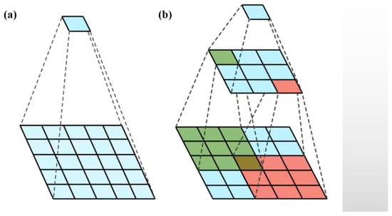 Sensory fields corresponding to two different convolution operations: (a) 5 × 5 convolution kernel and (b) 3 × 3 convolution kernel.