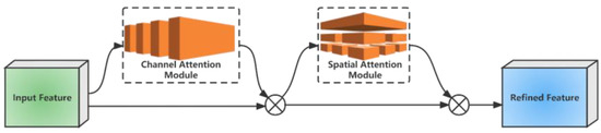 In addition, since we wanted the feature processing to focus on the direction of the pupil in the eye, the Convolutional Block Attention Model (CBAM) was inserted at the back of the ResBlock module. The CBAM module can improve the performance of convolutional neural networks for eye-tracking direction estimation by better learning and representing specific image features through the attention mechanism [48]. The overall process of the CBAM module can be divided into two parts, as shown in Figure 10.