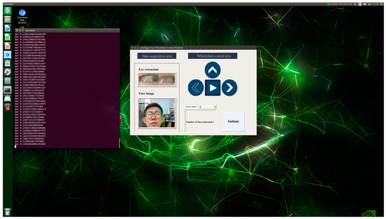 In the upper computer TX2, we designed the intelligent eye-tracking wheelchair control platform through PYQT5. The intelligent eye-tracking wheelchair control platform contains a data acquisition section and a wheelchair control section. The data acquisition section collects face and human eye images in real time. The wheelchair control section contains a wheelchair start button, wheelchair motion direction display, camera selection, and face count display functions. The intelligent eye-tracking wheelchair control platform makes it easier to achieve wheelchair activation and monitor wheelchair movement. The interactive interface is shown in Figure 13.