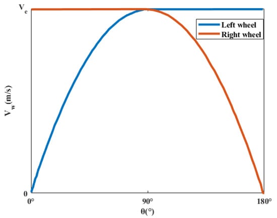 In the process of wheelchair steering, the motion path of the rocker will have an important impact on the acceleration change in the system because of the non-linear relationship between the left and right wheel speeds and the rocker angle, as shown in Figure 14. In order to make the wheelchair motion change smoothly and weaken the risk of vibration and even rollover caused by the sudden change of acceleration, this section presents the research on the rocker trajectory-tracking control.
