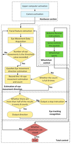 For wheelchair control, Delia Dragusin et al. used a pupil-corneal reflex-based approach to accomplish sight estimation on a PC, and the wheelchair control chip received eye-movement commands from a PC via Bluetooth and controlled relay closures to drive motor motion [29]. Razvan Solea et al. used the PCI protocol to send the eye-tracking signal from a PC via a data acquisition card to a servo amplifier, which, in turn, sent a PWM control signal to the DC motor [30]. Aniwat Juhong et al. used x-axis–y-axis servos to control the wheelchair rocker so that the wheelchair could theoretically have a 360° movement direction, which greatly improved the maneuverability of the wheelchair [31]. Sho Higa et al. bypassed the joystick and directly sent the eye-tracking signal output via an embedded AI computing device to the control system of a WHILL CR electric wheelchair through a USB to complete the control of the wheelchair movement. Although this control method is simple and reliable, the electric wheelchair it is paired with is very expensive [32].