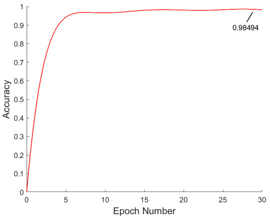 As shown in Figure 20, a total of 30 rounds were trained, and after 18 epochs of training, the accuracy curve gradually leveled off and no longer significantly improved, which indicated that the training of the classification network was completed. In this paper, we chose to save the weight parameters of the model at the 29th round, and its accuracy rate was 0.98494.