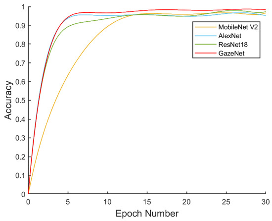 The GazeNet network described above was trained on the MEAGaze dataset using the same training set as the widely used AlexNet [56], ResNet18 [57], and MobileNet-V2 [58] models, and tested under the same test set. The test results are shown in Table 1 and Figure 21. The GazeNet network in this paper achieved an accuracy of 98.49% and used the smallest number of parameters, only 125,749, which was significantly better than the other three models. The comparison showed that the GazeNet network was about 1% point more accurate than the ResNet18 model, with the second-highest accuracy rate, while the former had only 22.3% of the number of participants of the AlexNet model, with the second-lowest parameter amount. The GazeNet network has a minimum number of parameters with excellent accuracy, which makes it an ideal lightweight model that can meet the needs of both high accuracy and low resource consumption.
