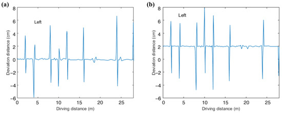 To make the data of the experiment generalizable, we recruited 20 volunteers aged 20–35 years to participate in the experiment. These 20 volunteers were 50% men and 50% women and wore glasses. Each volunteer was trained to operate a wheelchair while maintaining head immobilization to complete the experiment, during which the speed of the wheelchair was set to 1 . We installed a laser distance measurement module on each side of the wheelchair, as shown in Figure 23, which had a range of up to 80 m, a measurement accuracy of 1.0 mm, and a measurement frequency of 20 Hz. It can measure and record the distance to the wall in real time and obtain the deviation of the wheelchair center from the target path based on the distance to the wall. The values of deviation with a distance of movement at each experiment were totaled and divided by the total number of people, and a graph of deviation with a distance of movement was obtained, as shown in Figure 24. The fluctuating part of this figure is the deviation of the wheelchair during the turn, and the maximum deviation appeared at the second circle of 8 m, which was 6.76 cm. It can be seen that the deviation during the wheelchair movement was small, the accuracy of the model and control was high, and the eye-activated wheelchair we designed had high practicality.