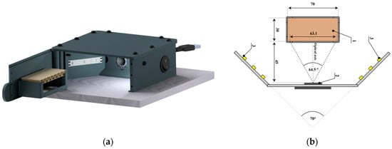 Device for corrugated board image acquisition: (a) visualization of the device; (b) layout diagram of the most important components of the device: 1—corrugated board sample; 2—camera; 3—LED strip.