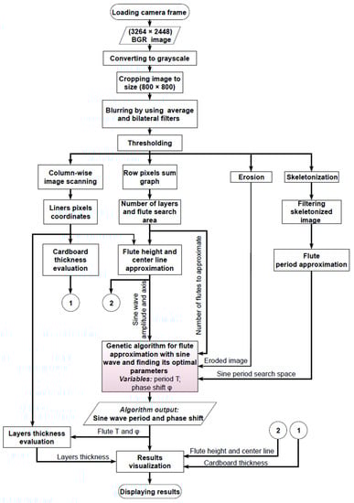 The flowchart of the proposed algorithm is presented in Figure 3. It consists of some preprocessing steps and parallel operations in which the geometrical features of the corrugated board, including its height, flute period and phase shift, liners and flute thickness, are determined. The algorithm has been implemented in Python language using the OpenCV library.