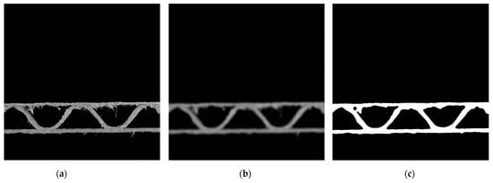 Results of the preprocessing stage: (a) a gray-scale cropped image of 800 × 800 pixels; (b) blurred image; (c) binary image.