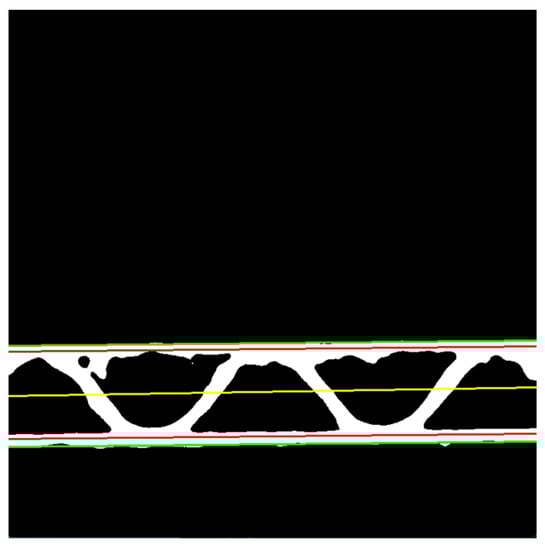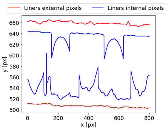 After the column-wise image scanning operation, the external boundaries of the liners can be determined using the matrices and . Both boundaries can be approximated using linear functions based on the matrices of these coordinates: