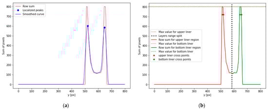 In the next stage, the corrugated cardboard center line and flute height are estimated. The row sum curve of the binary image is determined in order to find the localization of liners. Now, the rows of the binary image are analyzed and the sum of white pixels at each row is calculated. The corrugated carboard sample is placed horizontally. Therefore, the maximums in the row sum curve are related to the liners’ localizations. Due to the flute and other disturbances, many local maximums can be observed in the row sum curve. Therefore, curve smoothing is applied using the Savitzky–Golay filter with 30 interpolation points and a polynomial of the first degree. In such a way, the number of local minima is limited. Furthermore, to find the additional conditions, the following were taken into account: the minimal distance between maximums, which was equal to 20, and the minimal value of the local maximum, which was equal to 0.4 of the global maximum value. The local minimums, found in such a way, are related to the vertical positions of liners (their y coordinates). This study was limited to 3-layered corrugated boards, which always have 2 liners and 1 flute. Thus, at this stage, two local maximums should be detected, as is depicted in Figure 6a. This figure shows the row sum curve and the result of its smoothing using the Savitzky–Golay filter. It is also worth noting that for both the ideal samples and the creased samples, the layers of the corrugated carboard can have different thicknesses and can be deformed in different ways, which affects the peak values, and it is possible that they can differ significantly in the values of the local maximums.