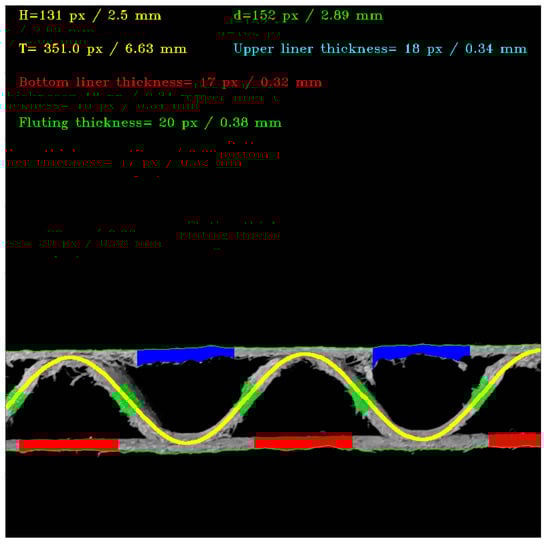 The estimation of the thicknesses is schematically shown in Figure 10. The estimated position of the flute in the image allows us to choose the areas of the liners and flute in which the thickness of the papers can be measured. It allows us to avoid the ranges of the gluing between the liner and flute. In these regions, there are also lower numbers of disturbances related to the fibers coming from the sample cutting process. The area of the upper liner, where the thickness can be measured, is marked in red. A similar area for the bottom liner is marked in blue. The green color indicates the area in which the thickness of the fluting layer is determined.