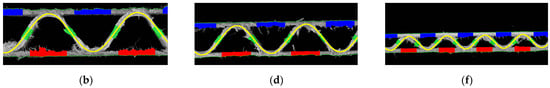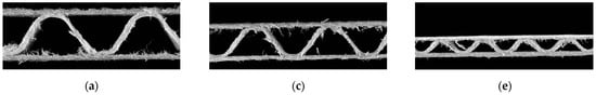 Visualization of the recognized fluting shapes of corrugated board: (a) flute C sample; (b) results obtained for the flute C sample; (c) flute B sample; (d) results obtained for the flute B sample; (e) flute E sample; (f) results obtained for the flute F sample.