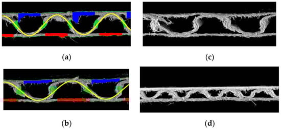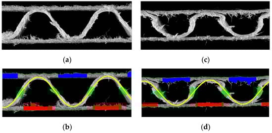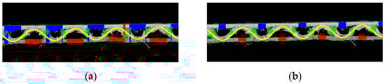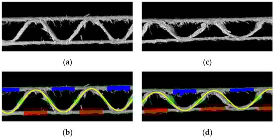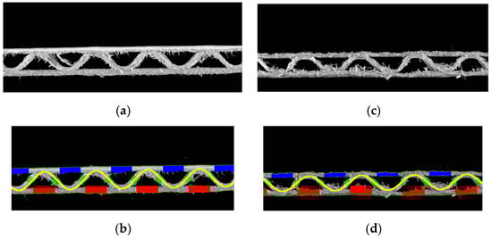 Unfortunately, almost all crushed microwave samples were only suitable for determining the wave period and amplitude (which are usually very well matched), while the problem was to determine the thickness of individual layers. This was due to too much interference (jagged fibers) in relation to the size of the area between the fluting walls. The solution that often allowed us to improve the efficiency of the algorithm was to limit the area on which the thickness of the liners was measured. The original example (weak effect) and the operation on the same image after changing this area are shown in Figure 17a,b, respectively.