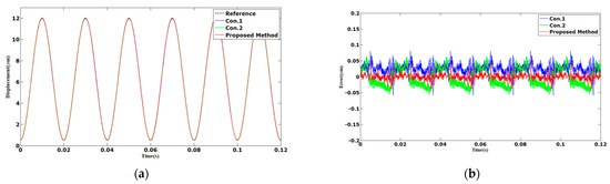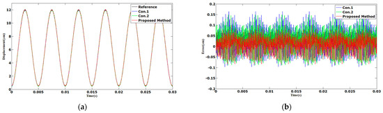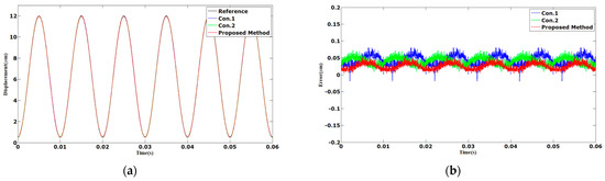 Comparison results of different methods under 50 Hz sinusoidal trajectories: (a) displacements; (b) errors.