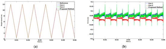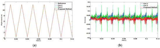 The tracking results of the sinusoidal and triangular trajectories with the 12 µm peak-to-peak amplitude and 1 Hz frequency are shown in Figure 3 and Figure 4. The AAE of the proposed method under sinusoidal and triangular trajectories were 0.0063 and 0.0132 µm, respectively. The MAEs of the proposed method were 0.0238 and 0.0478 µm, which was less than those of Con.1 and Con.2.
