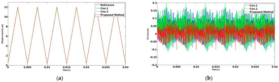 Comparison results of different methods under 200 Hz triangular trajectories: (a) displacements; (b) errors.