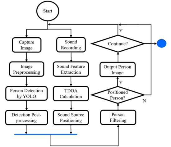 Figure 3 shows the system activity diagram of this study. Firstly, the video camera is used to capture images of the meeting room, and the microphone array is used to record the sound in the meeting room. These two devices capture the conference room situation (as an image and sound) at the same time. Next, the positions of the persons in the scene are obtained through the image, and the direction of the sound source is obtained through the microphone array. Finally, the sound source direction filters the persons obtained from the image. The retained person is the identification result for the output and repeats the above operations for the next time frame.